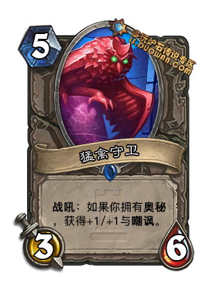 本身强度还行 5费47嘲讽,但也不算超模,还有使用条件.放在一起说, 如果奥秘法, 这张配合轮回还可以, 依旧亏节奏就是了. 圣骑士卡组里, 感觉没什么用. 子弹上膛猎..应该也不会选择他. 为什么说不超模呢,明明比熊德还多一血啊? 因为熊德是抉择效果,还有野兽属性.