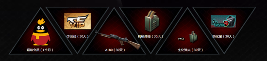 生化弹夹(30天)、CFVIP(30天)、超级会员一个月、A180(30天)、防化服(30天)、机枪弹匣(30天)