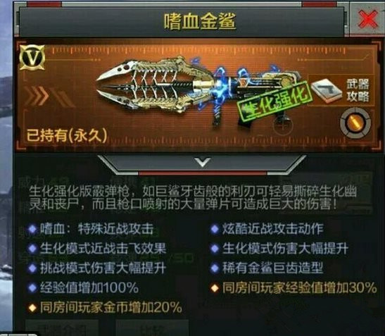 属性解析:此次新出的英雄武器嗜血金鲨在生化模式具有强大的威力,能够一发命中超高的伤害,对于喜欢生化的玩家来说是个不错的选择。