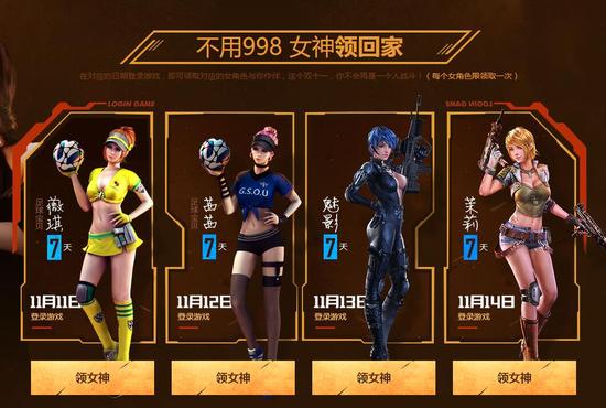 在对应的日期登录游戏,即可领取对应的女角色与你作伴,这个双十一,你不会再是一个人战斗!(每个女角色限领取一次)