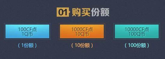 活动期间,在活动页面1Q币买100CF点,即可获得一个份额,10Q币1000CF点10个份额,依此类推,100Q币就是10000CF点100份额;