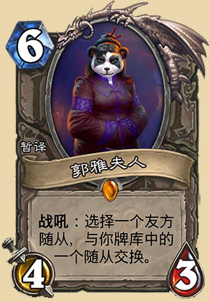 炉石传说郭雅夫人卡牌效果:战吼,选择一个友方随从,与你牌库中的一个随从交换。来自龙争虎斗加基森系列拓展包。