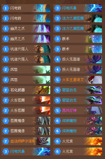 留牌:所有的斩杀卡牌前期都不能留,前期要的就是稳定,就是站场,所以留牌和中速萨满是一样的,爪子、魔像是最优先的,之后才是穴居人和火舌或者法力,这里就是自己根据局势来考虑的,对阵战士或许在之后留下一张法力图腾来过牌是不错的,总而言之灵活是你最需要考虑的。