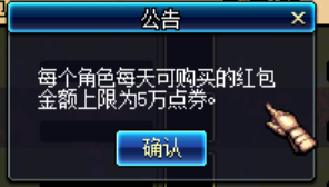 点击公会红包时,系统提示:每个角色每天可购买的红包金额上限为5万点卷。