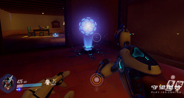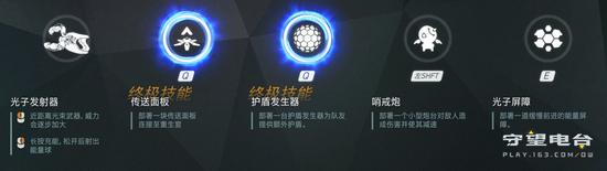 与传送门一样也是固定在地上,在50米范围内的友方会获得75点蓝色护盾,脱离范围或者发生器被破坏时,4-5秒后友方身上的75点额外护盾会消失,生成护盾没有视野要求。护盾发生器同样也是50血+350蓝盾。