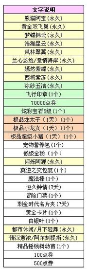 本期刮刮乐我们为大家准备了非卖坐骑熊猫阿宝,非卖双飞翅膀黄金双飞翼,经典浮云系列的梦蝶棉云、浩瀚星云,经典布衣系列的兰心悠悠/爱情海岸,非卖套装嫣然紫蝶、西域紫苏、冰纱玉洁等宝物。