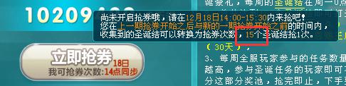 您在上一期抢券开始之后与新的一期抢券开始之前的时间内,收集到的圣诞结可以转换为抢券次数,15个圣诞结抢一次,12月12日-12月18日作为回馈周,仅需10个圣诞结可抢一次,抢券次数不累计,每一期抢券时间一定要来哦!