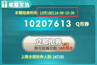 在游戏内“欢乐圣诞结”惊喜奖池抢券开启时间内参与抢券即可,每一期的抢券时间可以在界面查看,全服玩家获得的圣诞结越多,可被抢的Q币券越多,如果Q币券在抢券开启时间内被抢完了,即使抢券次数没有使用也不能再参与抢券咯!抢券次数不累计,每一期重新统计。