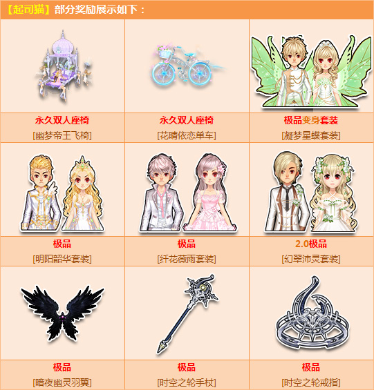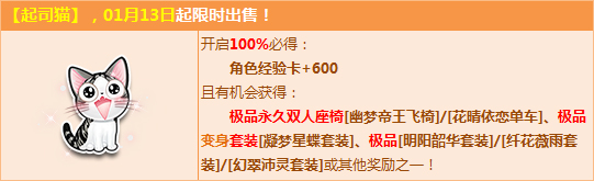 1月13日-2月14日期间,购【起司猫】,必得角色经验卡+600,且有机会得永久双人座椅【幽梦帝王飞椅】/【花晴依恋单车】、极品变身套装【凝梦星蝶套装】、极品【明阳韶华套装】/【纤花薇雨套装】/【幻翠沛灵套装】或其他奖励之一!
