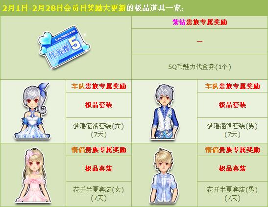 2月1日-2月28日期间,会员日奖励全面升级,极品豪礼轻松拿,包括Q币魅力代金券、人气专属套装、酷炫赛车等,千万不要错过哦!