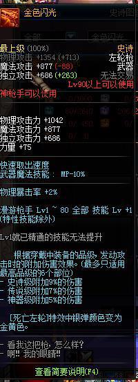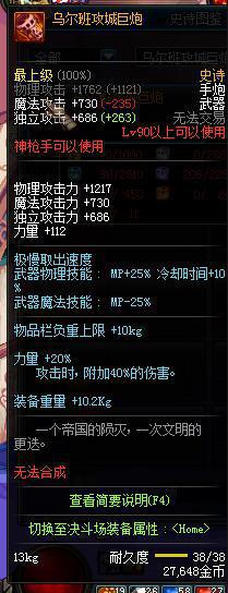 90史诗枪炮,大枪的神器。属性比荒古要好,加成40%的白字伤害,增加20%的力量(400+力量),属性逆天。