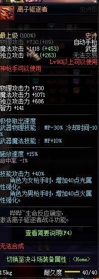 90史诗自动手枪,男枪增加光属性,女枪增加40点火属性。没有属性攻击,不过技能攻击力+40%,这个加成非常给力。