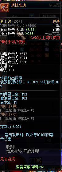 90史诗手弩,武器上写的穿刺力+100%目前并没有弄懂,后期等大神解答。手弩精通+5,物理暴击和魔法暴击都有加成,还有暴击攻击增加40%,这把武器用来堆暴击木有问题!