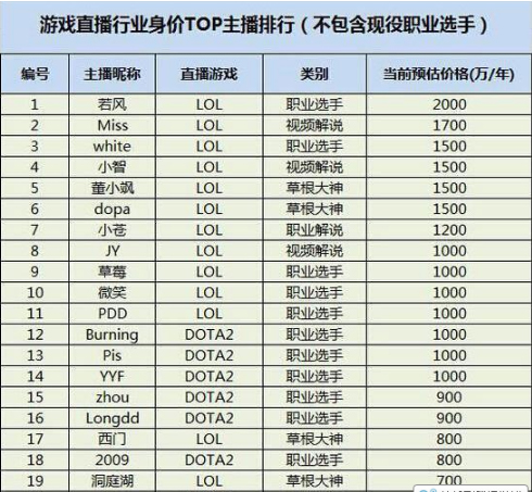 2015年初流传出当时的主播身价排行,TOP20的主播主要是被YY、斗鱼包揽;