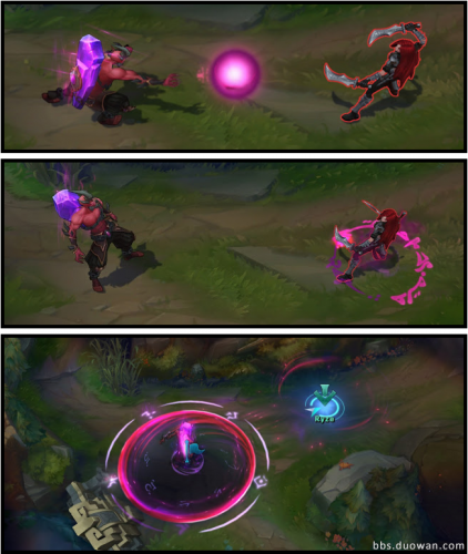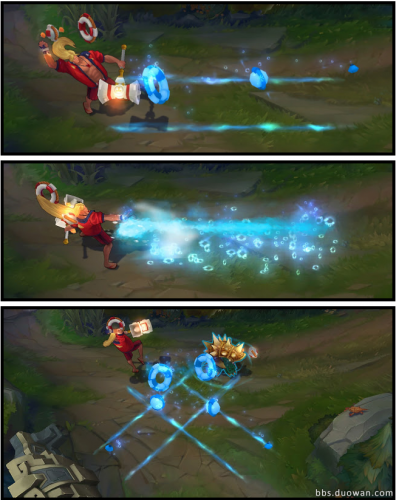 E:法术涌动 -对一个目标造成魔法伤害,同时将其标记以涌动效果。瑞兹的下一个技能如果击中带有涌动标记的目标,则会获得额外效果。
