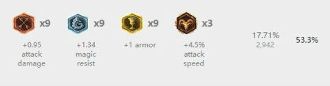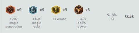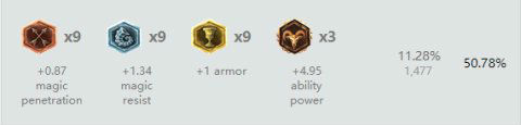 红色:6个攻击力和3个攻速 蓝色:9个法强 黄色:9个护甲 精华:3个攻速