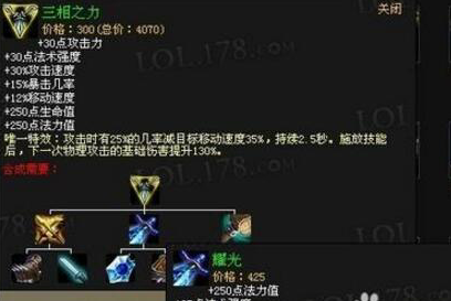 由于三相具有攻击力、攻击速度、暴击、生命值等。所以三相是其核心装备之一,出了三相后不断可以让你Gank能力增强,也可以让你在野区能混的更好。可以慢慢合出三相,先出小冰锤,然后耀光,狂热,最后合出三相为止。
