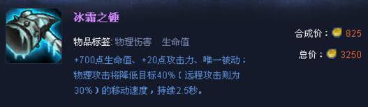 有了破败、日炎之后,继续出半肉,可以使你切后排时没那么容易死,由于冰锤具有黏人的被动,可以使攻击目标减少百分之40移动速度,所以冰霜之锤也是赵信必不可少的。