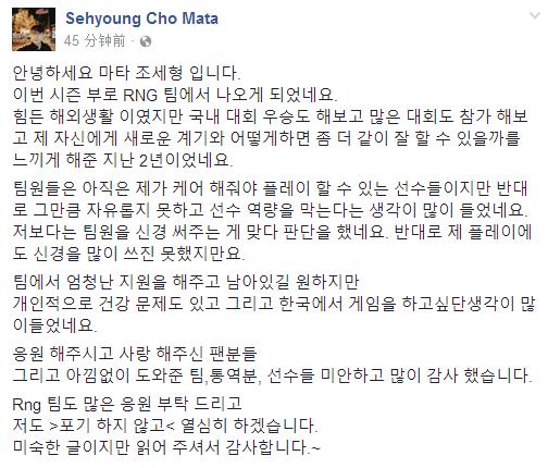 就在刚刚,Mata更新了Facebook,Mata宣布离开RNG 感谢队伍和粉丝支持。